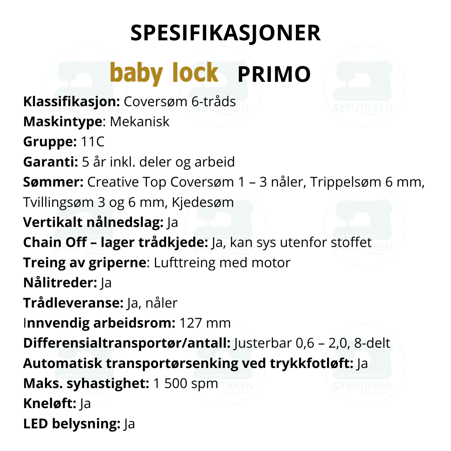 Baby Lock Primo er en covermaskin med en unik søm ”Creative Top Cover” sammen med en rekke variasjoner av ulike trippel-, tvilling- og kjedesømmer.