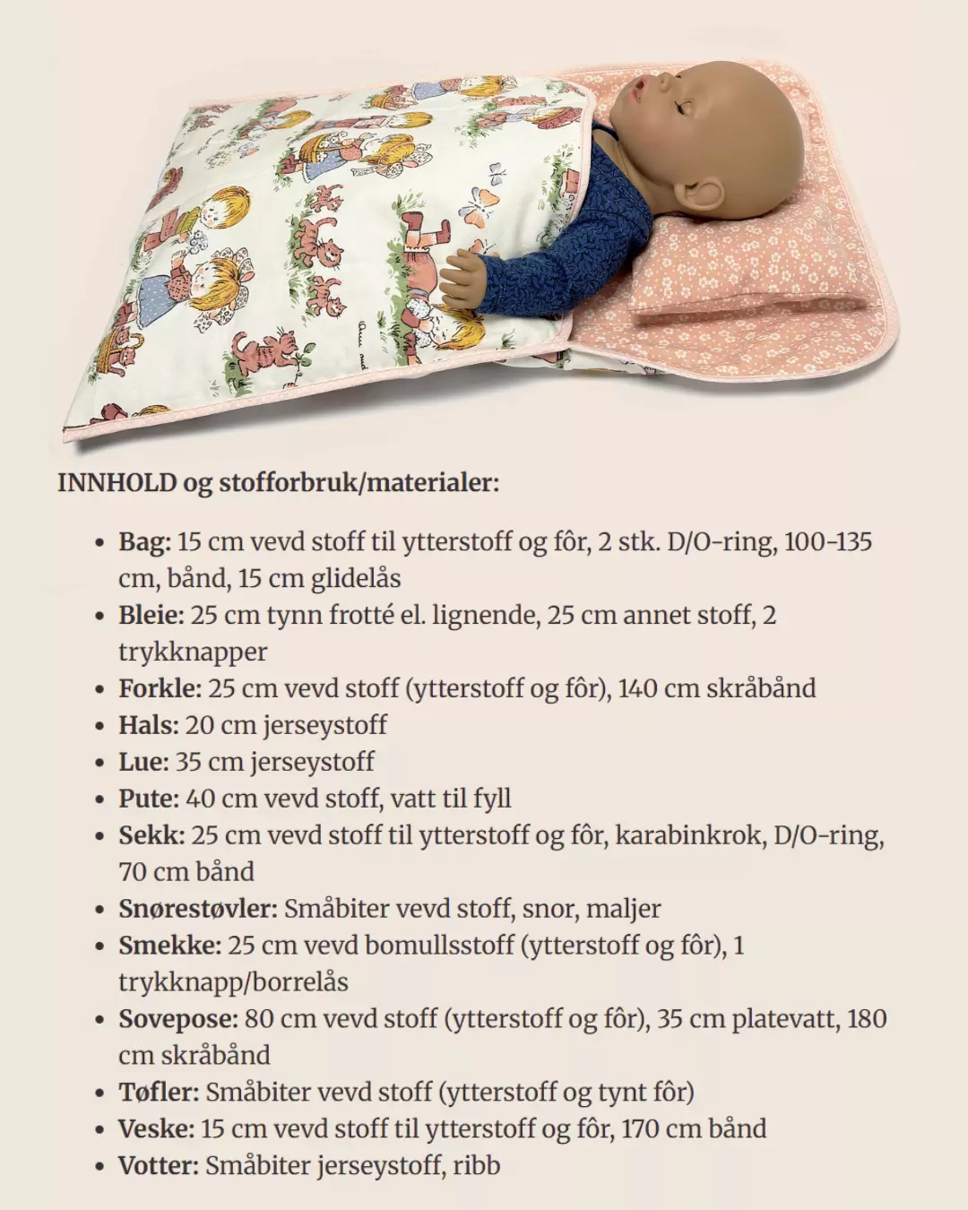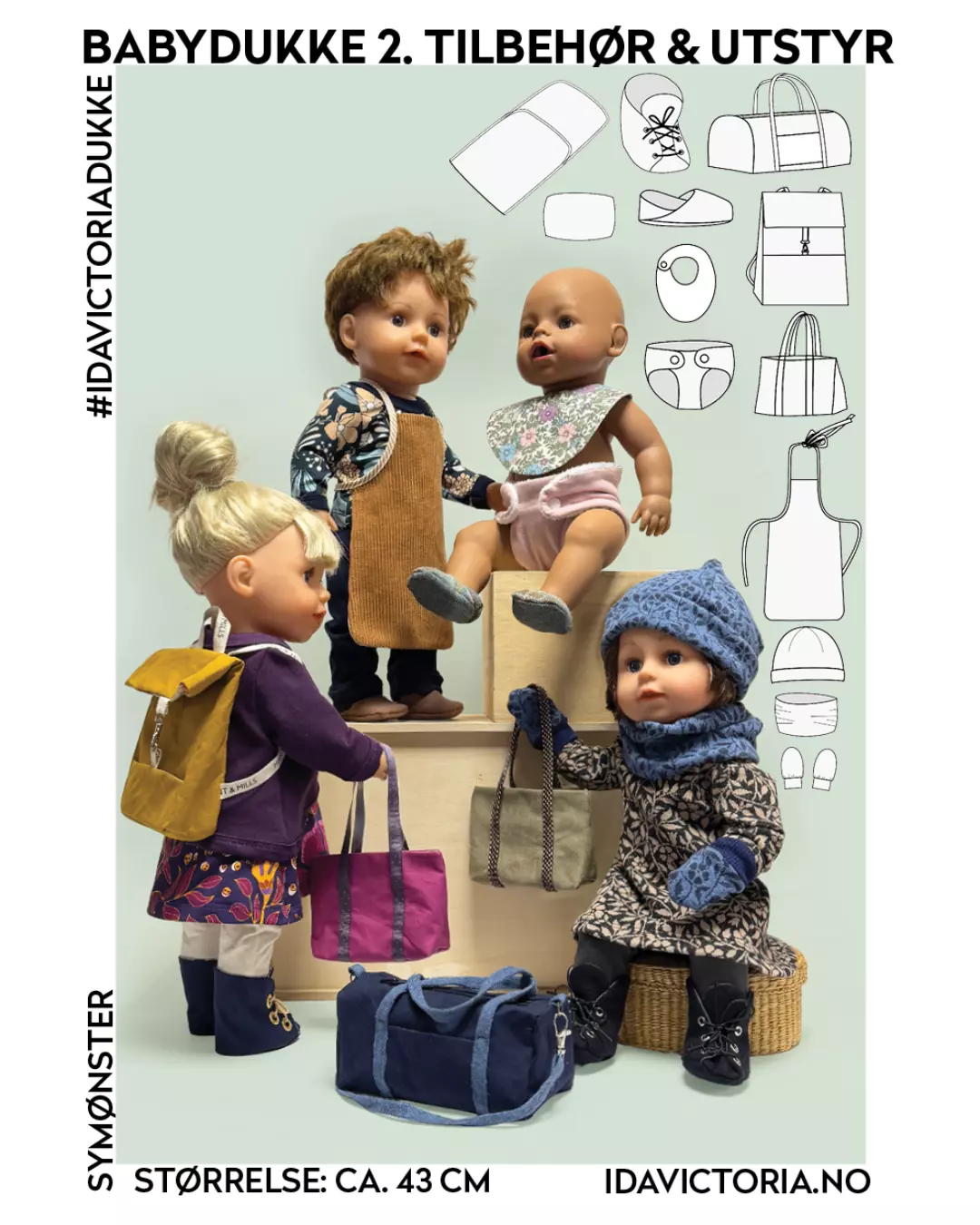 Alt er laget til babydukker i størrelse 43 cm, men fordi mye av det ikke skal passe på en kropp, kan flere av tingene fint brukes til større og mindre dukker eller bamser. Alle dukkene avbildet i heftet er 43 cm høye BabyBorn-dukker.