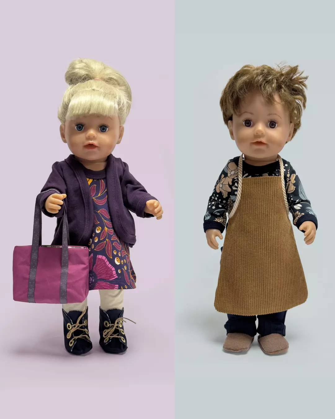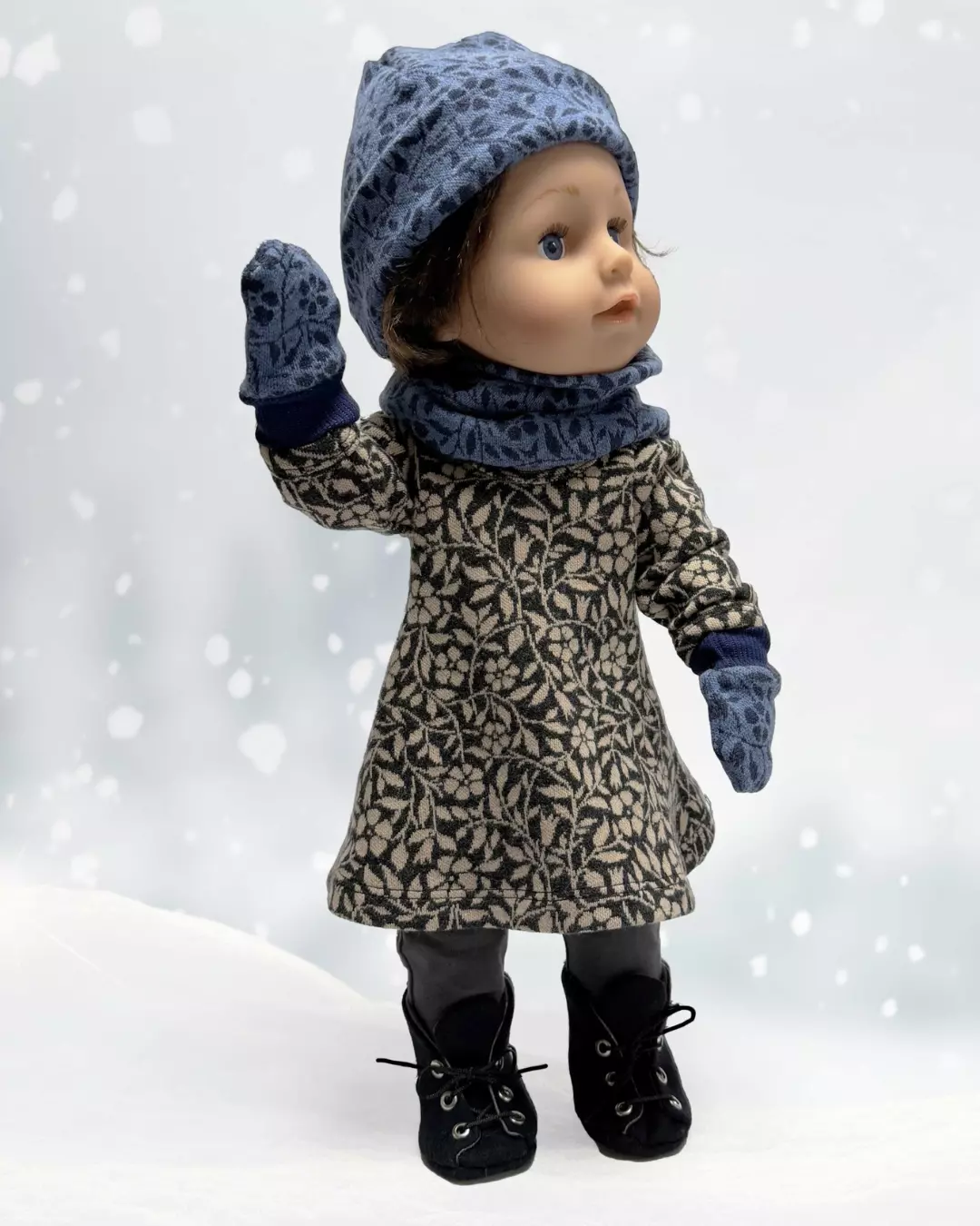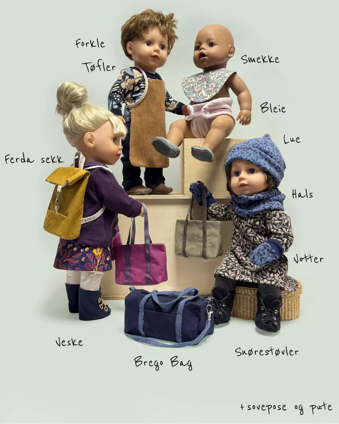 Det er ikke klær i dette heftet (med mindre man regner småplagg som lue og votter som klær) – så om du er ute etter klær til babydukken, finner du basisplagg i jersey til dukkegarderoben i mønsterheftet “Babydukke – 1. Basic jersey” fra Ida Victoria. Dukkene her har på seg klær fra det mønsteret.
