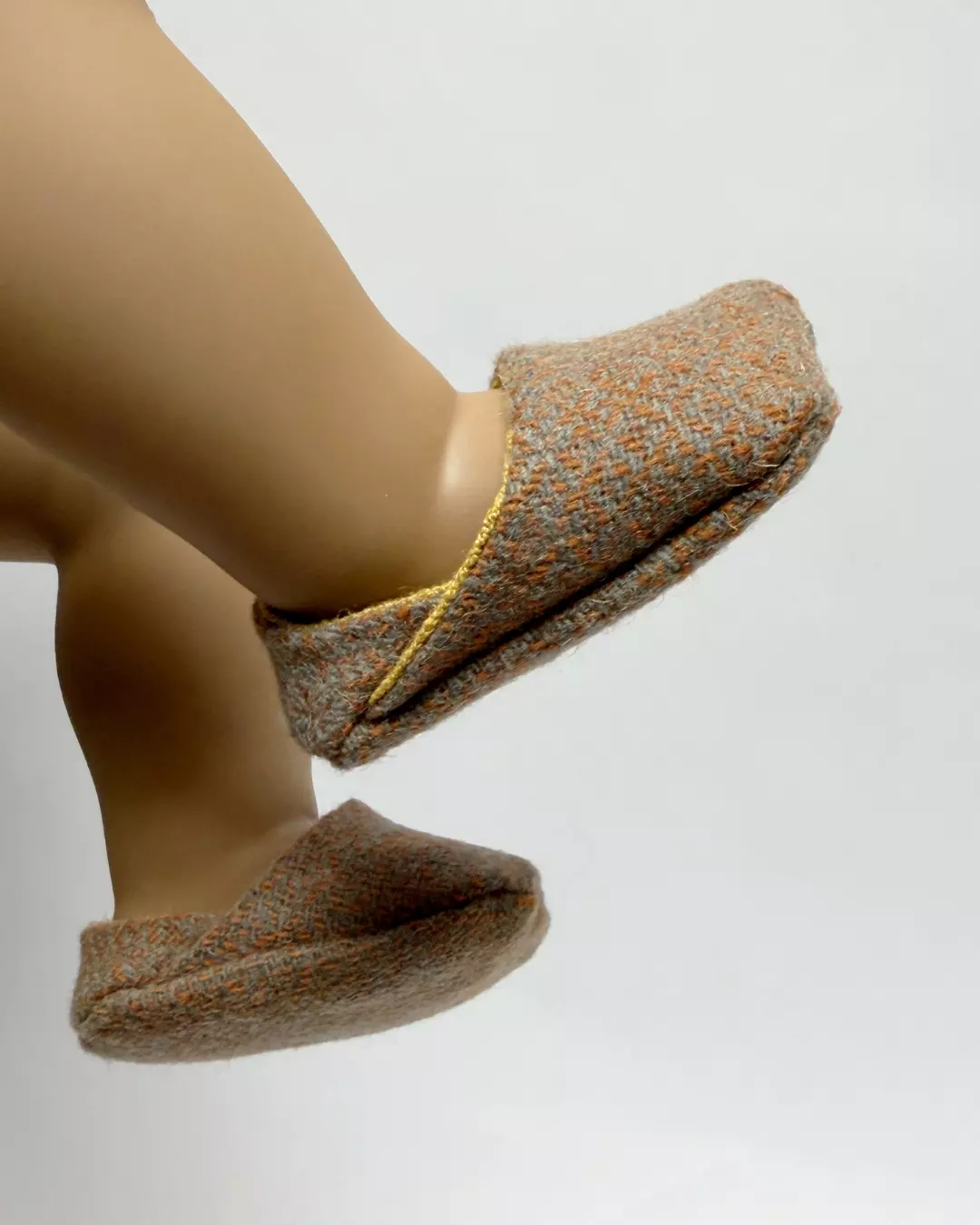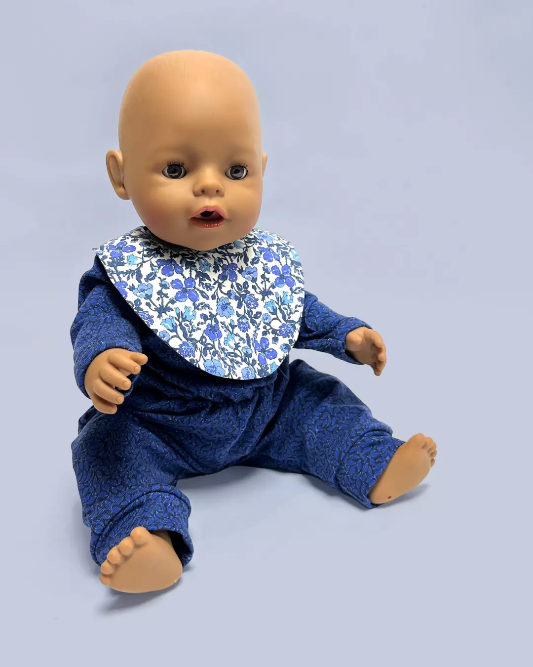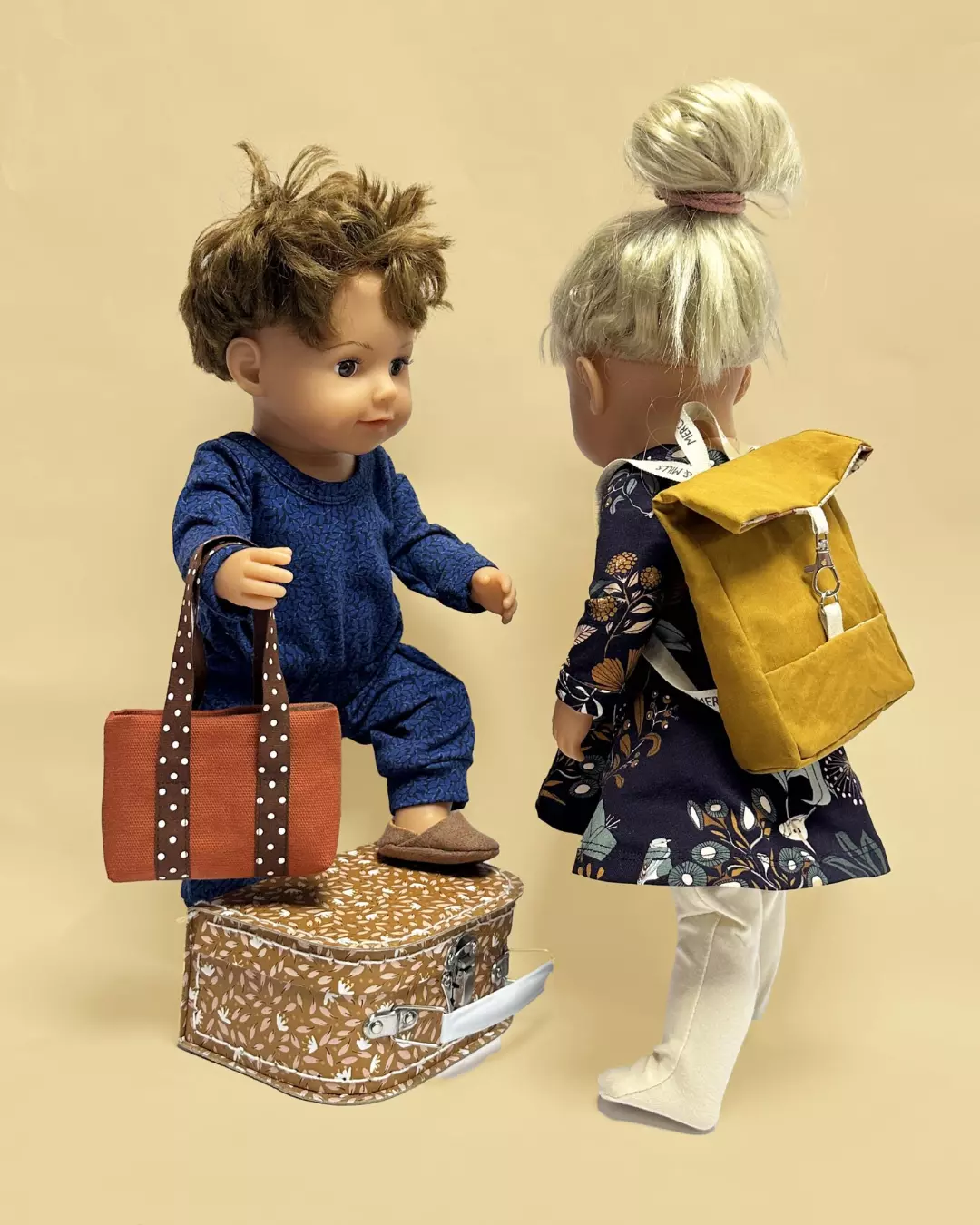Det er ikke klær i dette heftet (med mindre man regner småplagg som lue og votter som klær) – så om du er ute etter klær til babydukken, finner du basisplagg i jersey til dukkegarderoben i mønsterheftet “Babydukke – 1. Basic jersey” fra Ida Victoria. Dukkene her har på seg klær fra det mønsteret.