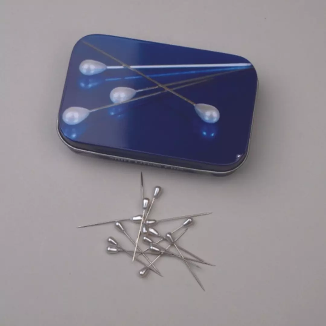 Boks med pene knappnåler. Nålene har hvitt perlehode.