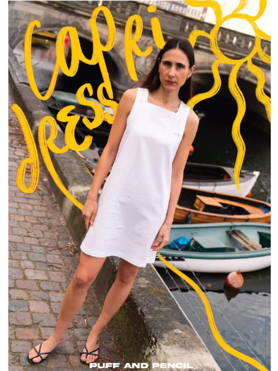 Symønster på en a-formet kjole med litt løs fasong og firkantet hals. Den har innsnitt ved bysten og skjulte lommer i sidesømmen. Den åpnes med en knapp bak i halsen. Kjolen kan kombineres med andre ermer fra Puff & Pencil.