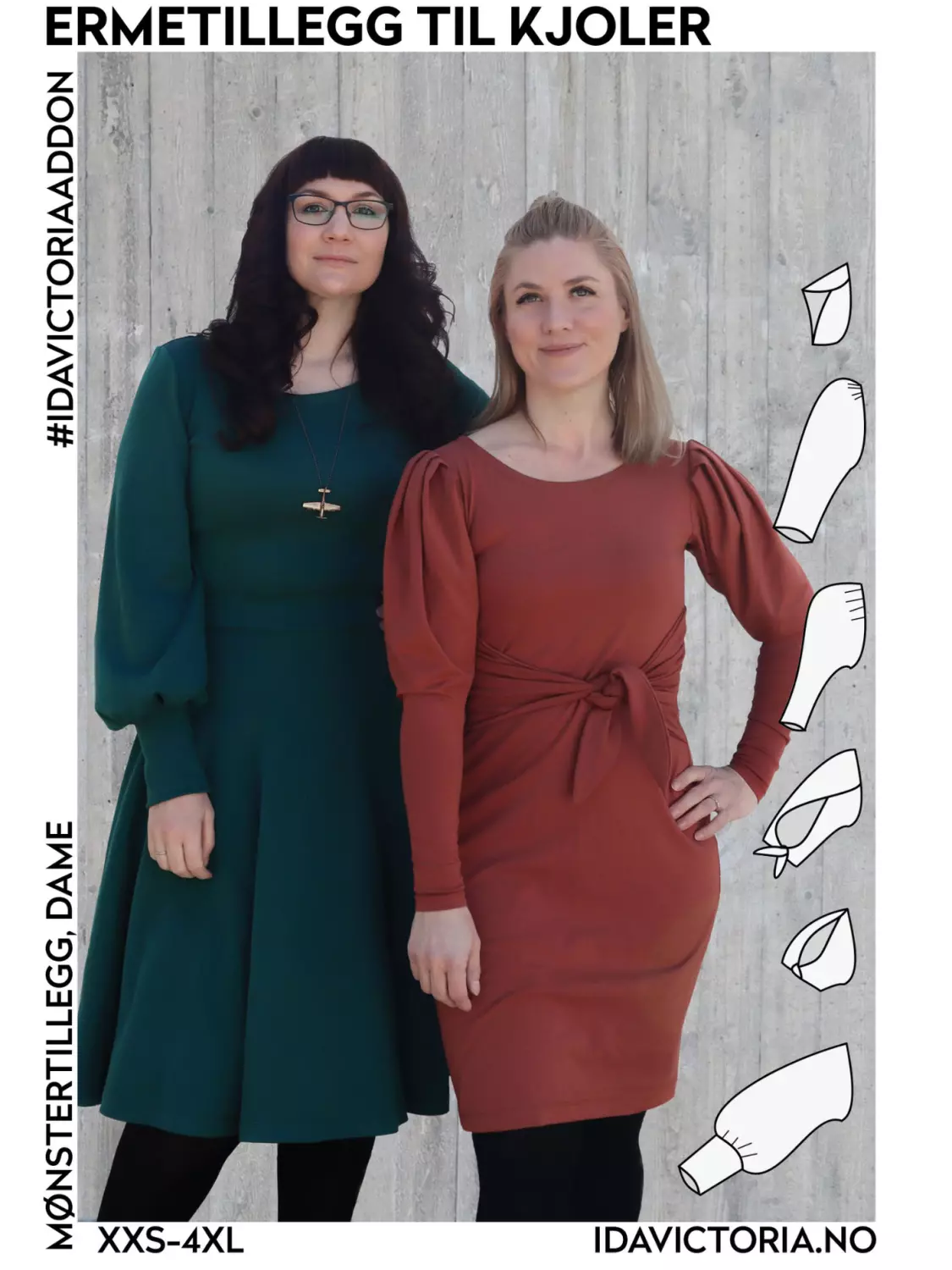 NB! Dette mønsteret inneholder kun ermene. Kjolemønstrene kjøpes separat. Alle ermetilleggene kommer i damestørrelse XXS-4XL. Velg samme størrelse på ermet som på kjolen, basert på størrelsestabeller du finner i kjolemønstrene.