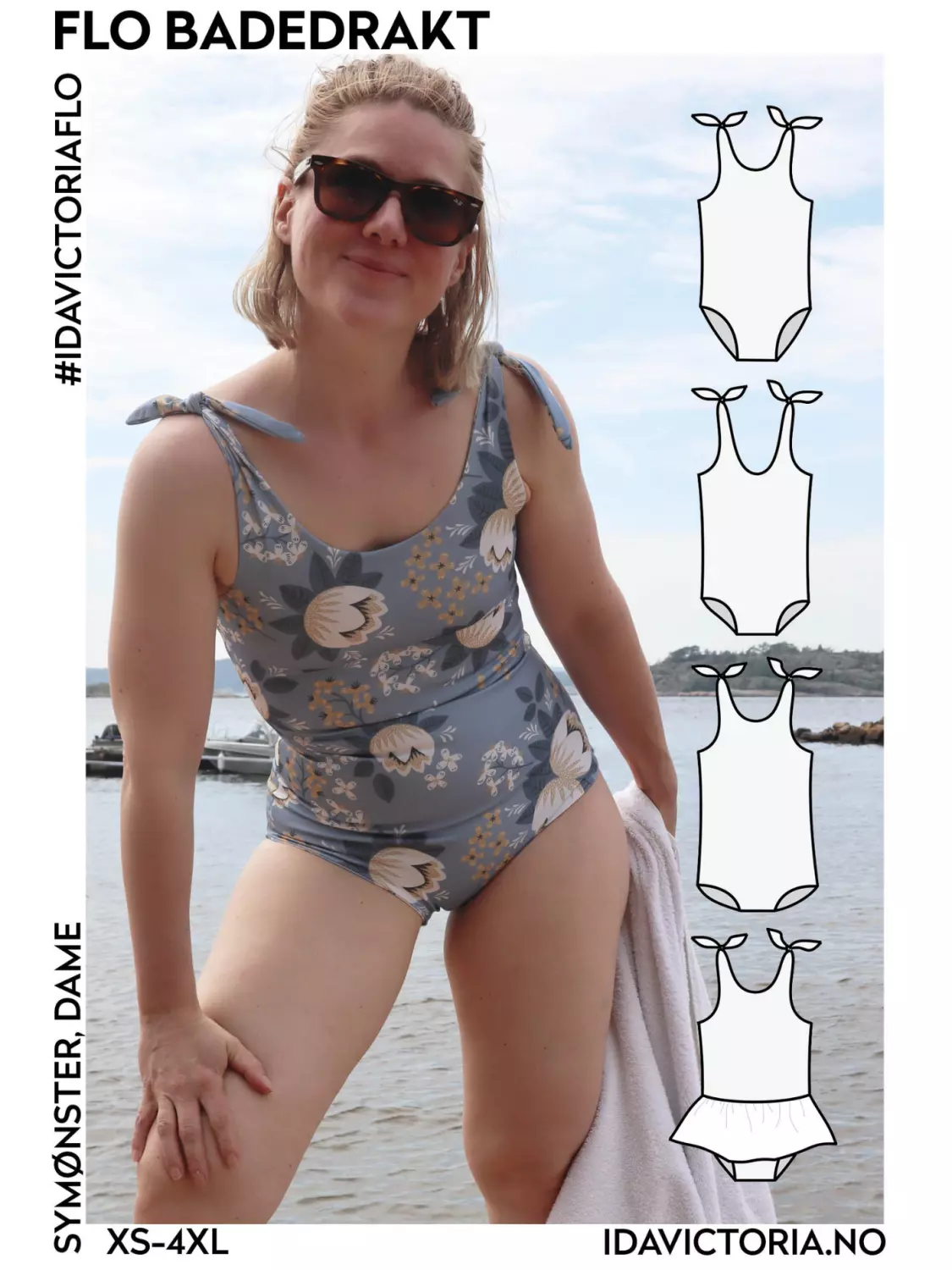 Symønster på enkel og klassisk badedraktmodell, som knytes over skuldrene. Det er en godt dekkende badedraktmodell, som er behagelig å ha på. Du har to ulike valg for halsåpning og tre ulike valg for skjæringen rundt lårene. Det er også mulig å sy badedrakten med en ekstra inner-BH for ekstra støtte, og du kan velge å sy badedrakten med eller uten skjørt/kappe.