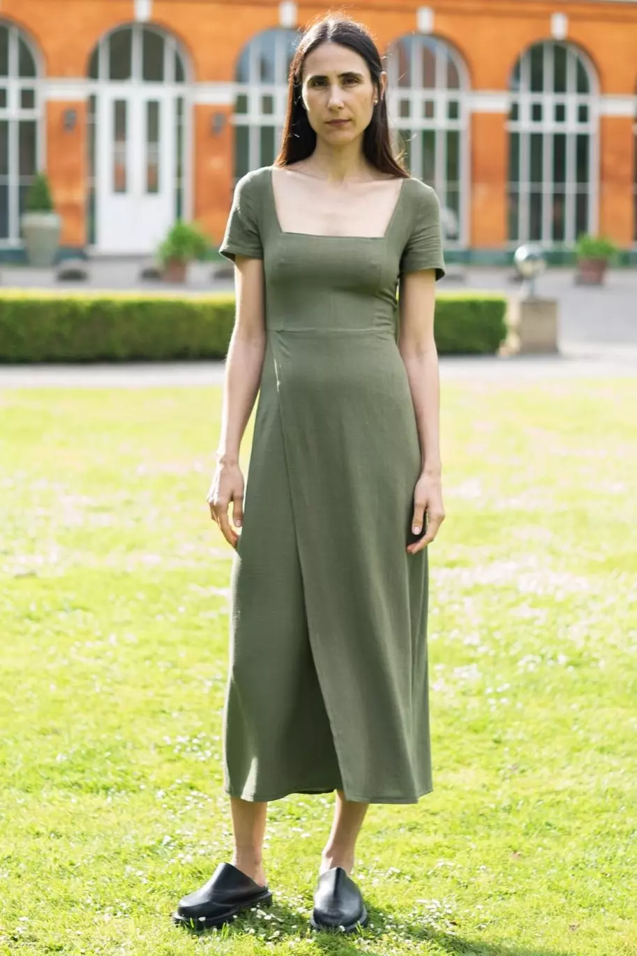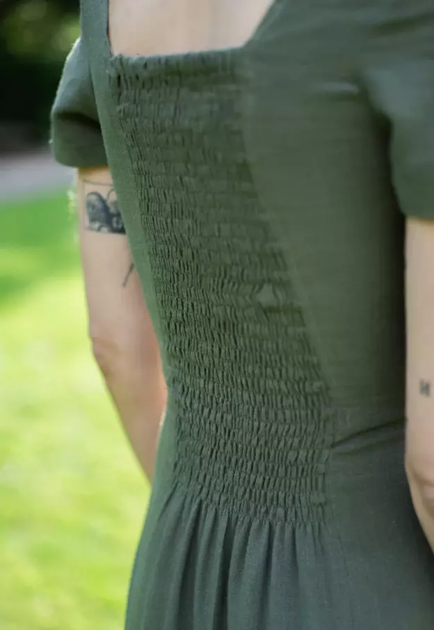 Denne kjolen har en firkantet halsutringning og prinsessesømmer ved bysten, noe som gir en flott form på overdelen. Et bredt «smockpanel» bak gir en tettsittende passform og gjør kjolen enkel å ta av og på. Skjørtet er smalt og delt foran, noe som skaper en splitt som åpnes når du går.