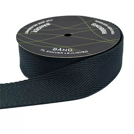Kraftig bånd i polyester med herringbone-vev. Brukes ofte til bagger, handlenett, vesker, sekker og lignende.
