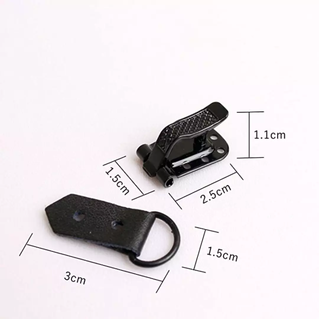 Klipsfester for lukking av pelsjakker og -frakker. Målehull med påsydd lærrem.