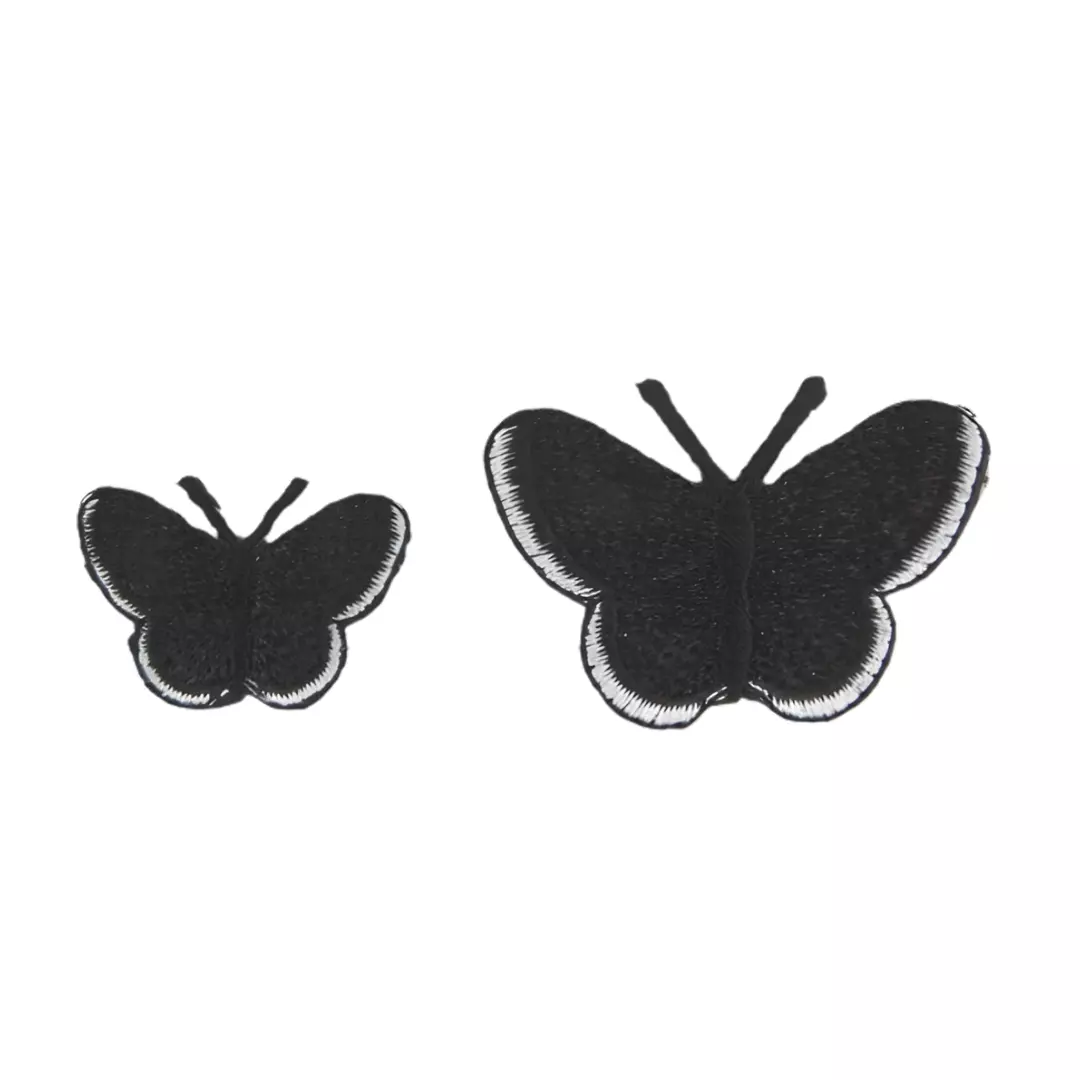 Strykemerker til reperasjon og dekorasjon. To svarte sommerfugler med hvit kant.